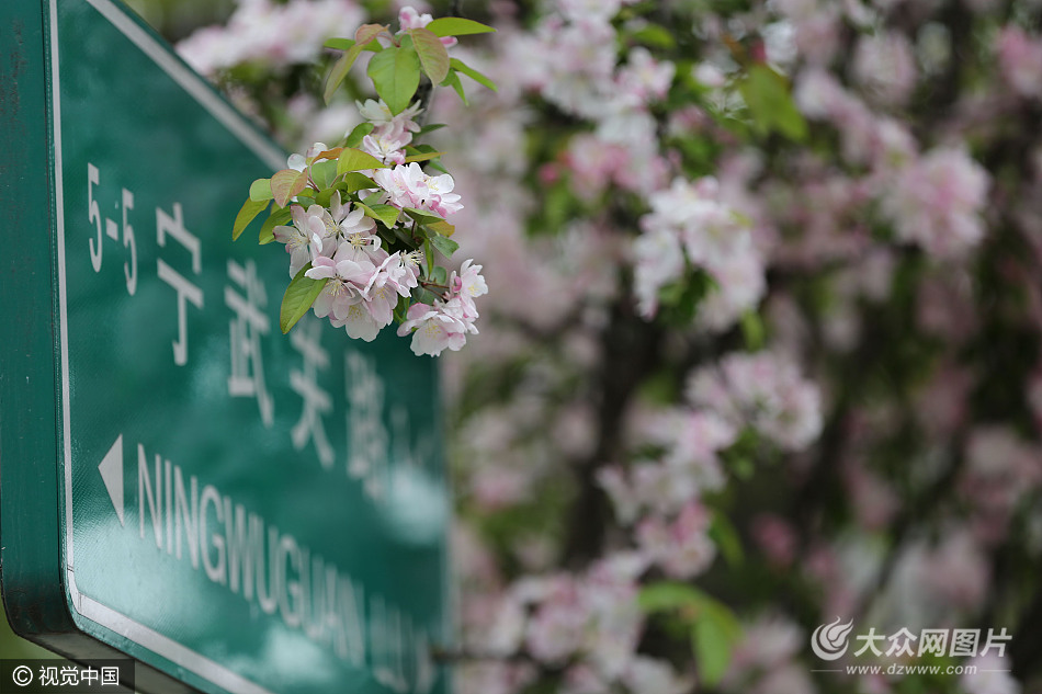 2017年4月19日,青島八大關寧武關路海棠花爛漫。每年4月中旬,青島八大關著名的海棠大道寧武關路兩旁海棠花爛漫,吸引眾多市民和游客前來賞花拍照,花海人潮共浪漫。214、219路兩條公交車經停寧武關路上的嘉峪關路公交車站,乘客“坐上開往春天的公交車”在鮮花掩映下穿行,如同置身于陶淵明筆下桃花源記:忘路之遠近,忽逢海棠林,芳草鮮美,落英繽紛,令人心曠神怡流連忘返。