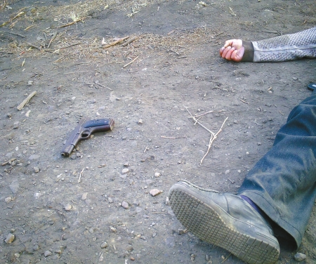 “砰!砰!砰!”三槍過(guò)后,舉槍男子應(yīng)聲倒地,癱倒在血泊中。