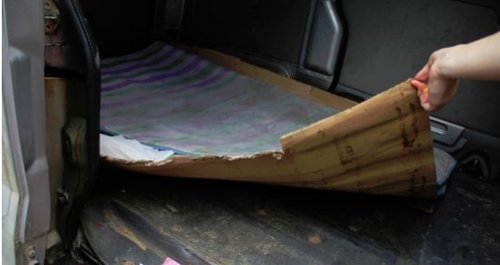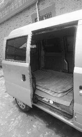 面包車后排座位被拆掉,車廂里鋪上紙板和草席