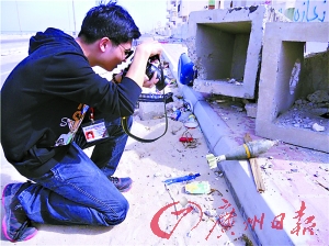 記者拍攝路邊未被引爆的炸彈。