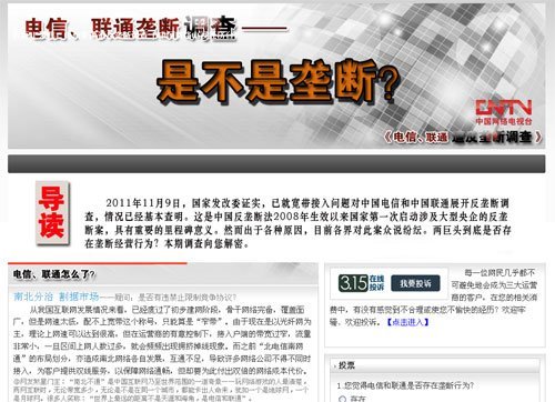 圖片為中國(guó)網(wǎng)絡(luò)電視臺(tái)有關(guān)電信聯(lián)通壟斷調(diào)查一事專題報(bào)道截屏