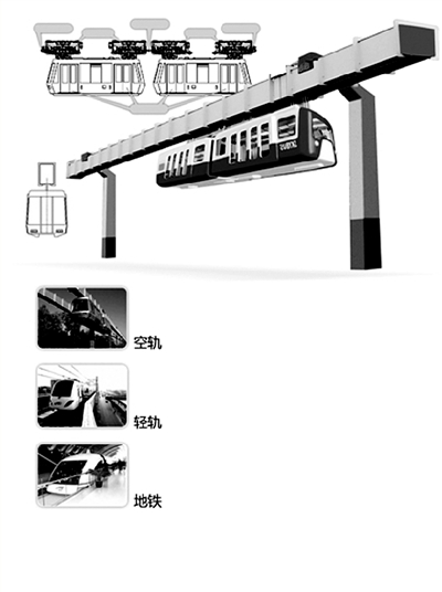 “空軌”屬于城市快捷公交,是懸掛式單軌交通運(yùn)輸系統(tǒng)。軌道位于列車(chē)上方,由鋼鐵或水泥立柱支撐,列車(chē)被吊在半空中行駛。