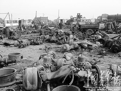 走進大門,這家公司規模之大令記者吃了一驚。公司占地達上百畝,到處停放著各種報廢車輛和拆卸下來的廢舊汽車配件。有很多人和車進進出出,非常熱鬧。不時有人開著三輪車、小面包車運輸各種汽車配件,有的挑幾個軸承,有的拿幾個后橋,有的拿輪轂……記者在現場看到,一個人正在挑汽車后橋,價錢是每個1200元。記者問“拿這些東西做什么”,回答說“回去裝啊”。