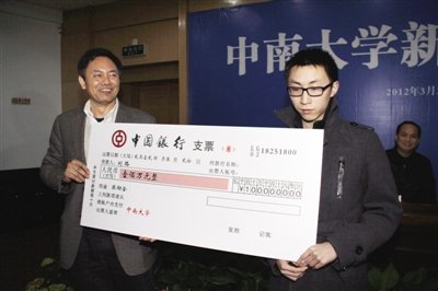 3月20日,中南大學校長張堯學(左)為劉路頒發獎金100萬元。新華社發