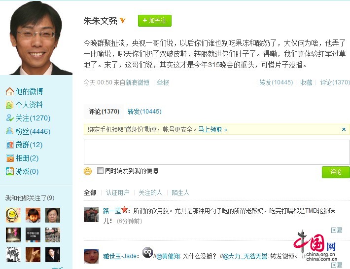 這位經濟觀察報調查新聞部記者朱文強的微博原文為“今晚群聚扯淡,央視一哥們說,以后你們誰也別吃果凍和酸奶了,大伙問為啥,他弄了一比喻說,哪天你們扔了雙破皮鞋,轉眼就進你們肚子了。得嘞,我們算體驗紅軍過草地了。末了,這哥們說,其實這才是今年315晚會的重頭,可惜片子沒播。”