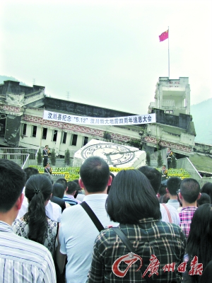 14時28分,近千名群眾來到映秀地震紀念館,面對當時保留下來的傾頹的房屋和崩裂的、定格在14時28分的巨石鐘表,眾人肅穆地低下頭默哀3分鐘,現場鴉雀無聲。隨后,不少人在巨石鐘表前獻上菊花,寄托哀思。