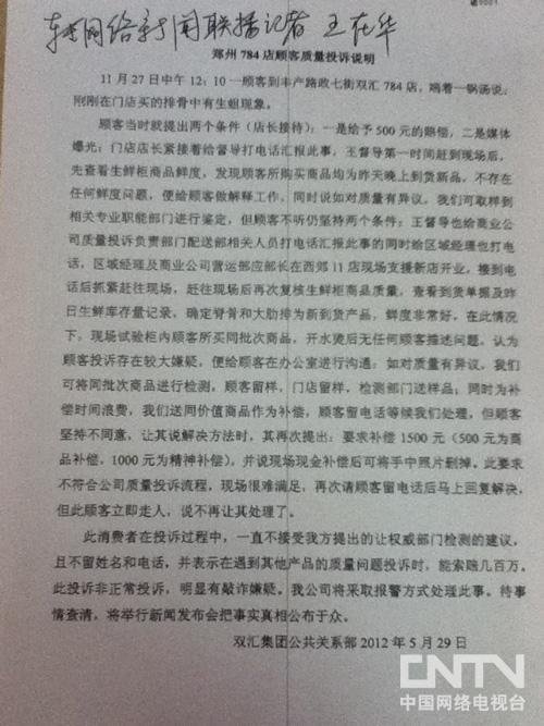 聲明稱:11月(本網注:應為5月)27日中午12:10一顧客到豐產路政七街雙匯784店,端著一鍋湯說:剛剛在門店買的排骨中有生蛆現象。店長接待時,顧客提出兩個條件:一是給予500元的賠償,二是媒體爆光(本網注:曝光)。店長請示后王督導趕到現場請示情況,顧客不聽仍堅持兩個條件,區域經理及商業公司營運部應部長隨后趕到現場。四級負責人當場復核,查看相關單據和貨品,確定脊骨和大肋排為新到貨產品,鮮度非常好。現場試驗柜內顧客所買同批次商品,開水燙后無任何顧客描述問題,認為顧客投訴存在較大嫌疑。雙匯先后提出顧客留樣,檢測部門送樣品給予適當補償等解決方法。而顧客再次提出;要求補償1500元(500元為商品補償,1000元為精神補償),并說現場現金補償后可將手中照片刪掉。