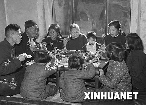 除夕之夜,家人團圓,守歲圍爐,溫情四溢。圖為1953年春節,天津市漢沽區蘆臺王德鑄(左一)一家人吃團圓飯。