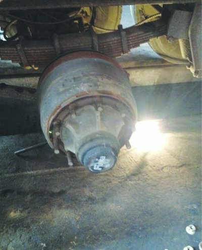 該車車牌號“贛GC”開頭,紅色,為重型卡車“東風天龍”。輪子非常多,也不是新車,已經跑了不少路程。6月1日已更換制動轂。