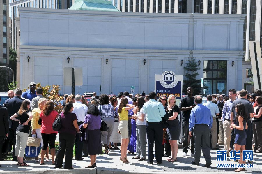 8月23日,在美國弗吉尼亞州阿靈頓縣,人們在地震發生后聚集在室外。美國東部地區于美國東部時間23日13時51分(北京時間24日1時51分)發生里氏5.9級地震,首都華盛頓及紐約有明顯震感。新華社記者冉維攝