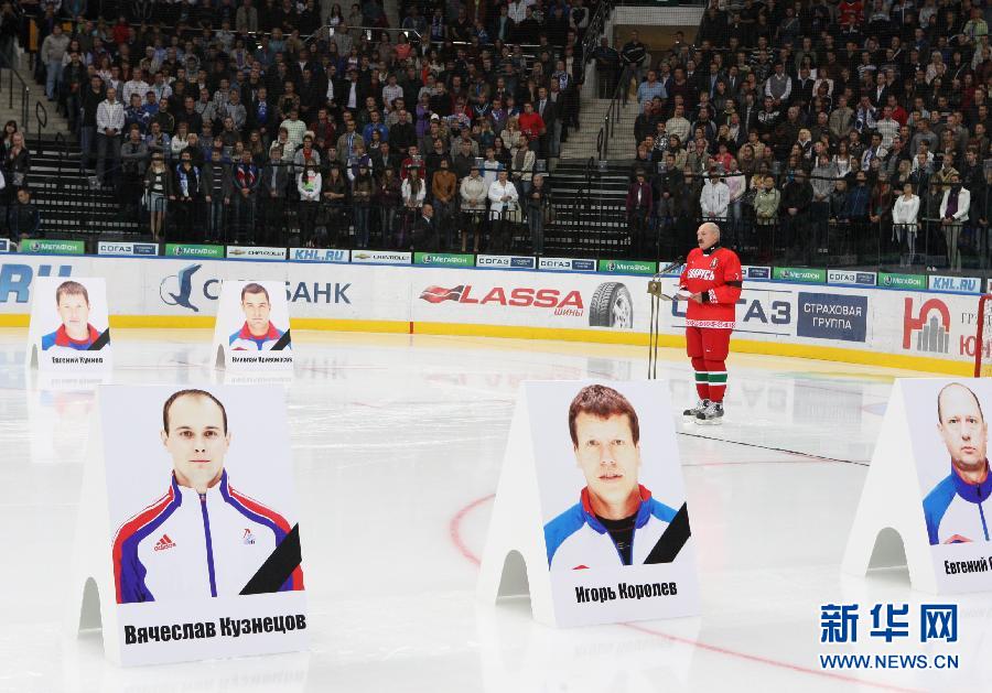 9月8日,在白俄羅斯首都明斯克的“明斯克-舞臺”體育中心,白俄羅斯總統盧卡申科參加為遇難的雅羅斯拉夫爾火車頭冰球隊隊員舉行的悼念活動。隸屬于“雅克-服務”航空公司的一架雅克-42型客機莫斯科時間7日16時許從雅羅斯拉夫爾市機場起飛不久后墜毀,造成43人死亡。機上搭載的是俄羅斯雅羅斯拉夫爾火車頭冰球隊成員,他們原本計劃飛往明斯克,于8日與明斯克迪納摩冰球隊進行大陸冰球聯盟新賽季首戰。“明斯克-舞臺”體育中心就是原本將舉行這場比賽的場所。新華社/白通社