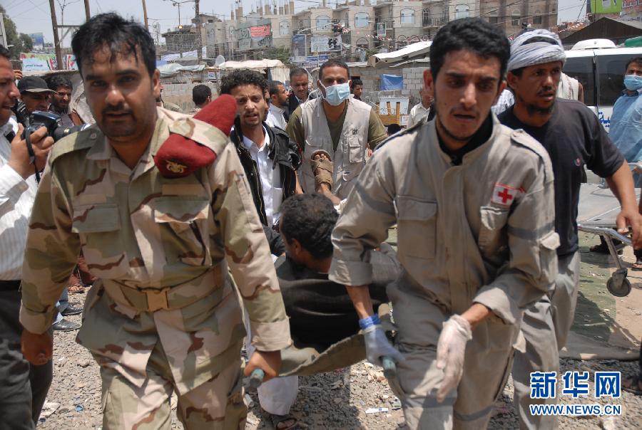 9月19日,在也門首都薩那,變節軍士兵與示威者搬運傷者。當日,也門數萬名反政府示威者在首都薩那和南部塔伊茲等省份舉行示威游行,再次與安全部隊發生沖突,導致至少31名示威者死亡、300多人受傷。新華社發(穆罕默德攝)