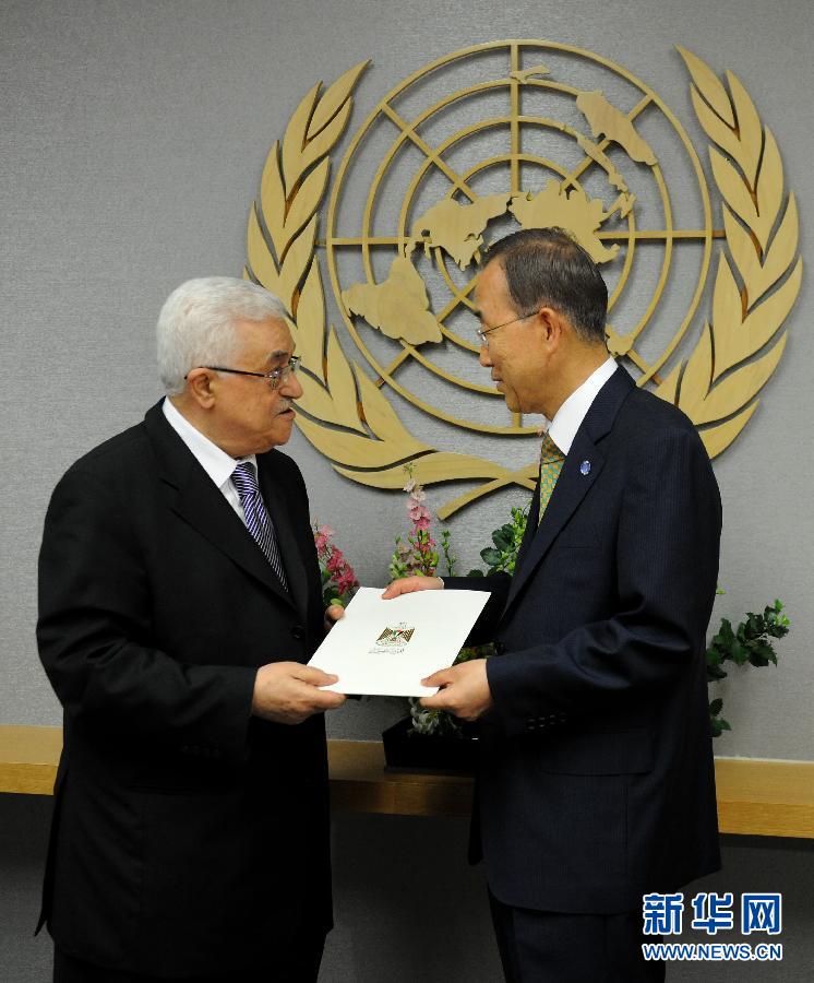 9月23日,巴勒斯坦民族權力機構主席阿巴斯(左)在紐約聯合國總部向聯合國秘書長潘基文遞交巴勒斯坦尋求成為聯合國第194個會員國的申請。新華社記者申宏攝
