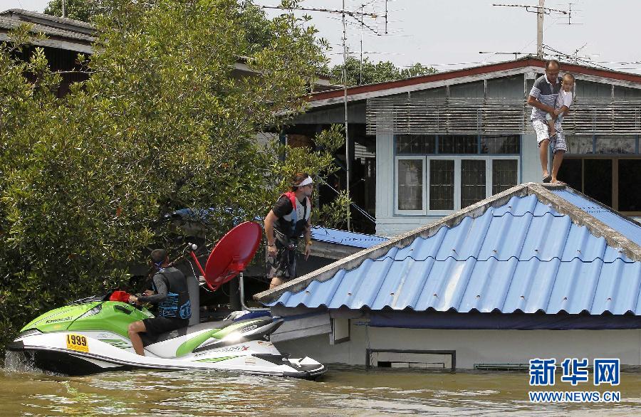10月9日,在泰國(guó)大城府洪水災(zāi)區(qū),一名懷抱孩童的男子站在被淹房屋的屋頂?shù)却仍L﹪?guó)救災(zāi)機(jī)構(gòu)9日說(shuō),持續(xù)兩個(gè)多月的洪災(zāi)造成的死亡人數(shù)目前已增至261人,另有4人失蹤。同日,泰國(guó)總理英拉宣布,取消訪問(wèn)馬來(lái)西亞和新加坡的計(jì)劃。新華社/路透