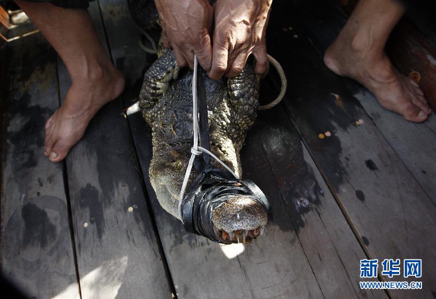 泰國救援人員在泰國大城府省的洪災(zāi)區(qū)捕獲一只鱷魚。截至15日,泰國持續(xù)兩個(gè)多月的洪災(zāi)已造成297人死亡、2人失蹤。 新華社/路透