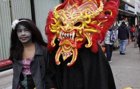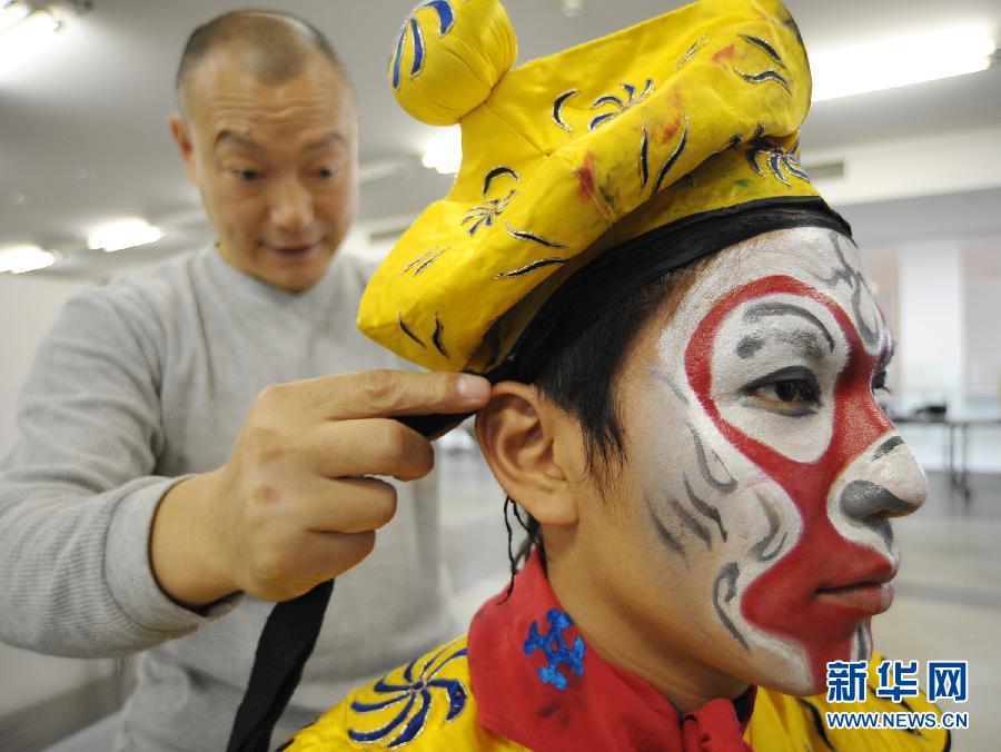 11月3日,在日本東京的明治大學,表演京劇的學生(右)在上臺前化妝。當日是日本的“文化日”,東京各地舉辦各種文化活動,很多文化遺產對市民免費開放。著名學府明治大學每年11月都在位于杉并區的和泉校區舉辦校園文化節,今年正巧碰上文化日,吸引了眾多參觀者。明治大學學生表演的京劇《盤絲洞》則獨樹一幟,成為文化節的一個亮點。新華社發(關賢一郎攝)