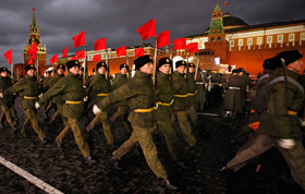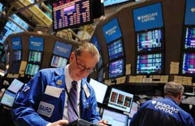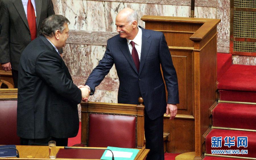 11月4日,在希臘雅典,希臘總理帕潘德里歐(右)在議會與財政部長韋尼澤洛斯握手。帕潘德里歐領導的希臘政府贏得了5日凌晨在首都雅典舉行的議會信任投票。帕潘德里歐領導的希臘政府贏得了5日凌晨在首都雅典舉行的議會信任投票。