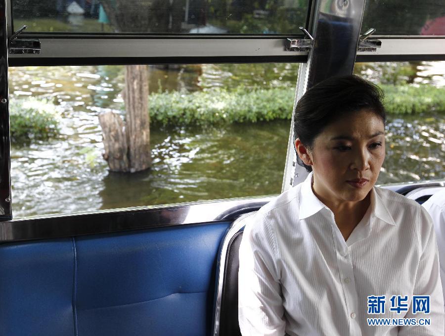 11月7日,在泰國曼谷洪水災區,泰國總理英拉坐在一輛車上。泰國總理英拉8日說,由于國內洪災依然嚴峻,她決定取消出席亞太經合組織(APEC)第19次領導人非正式會議的行程,由副總理兼商業部長吉滴叻代為出席。英拉說:“所有泰國人現在應齊心協力,幫助國家走出這場洪水危機。” 新華社/路透