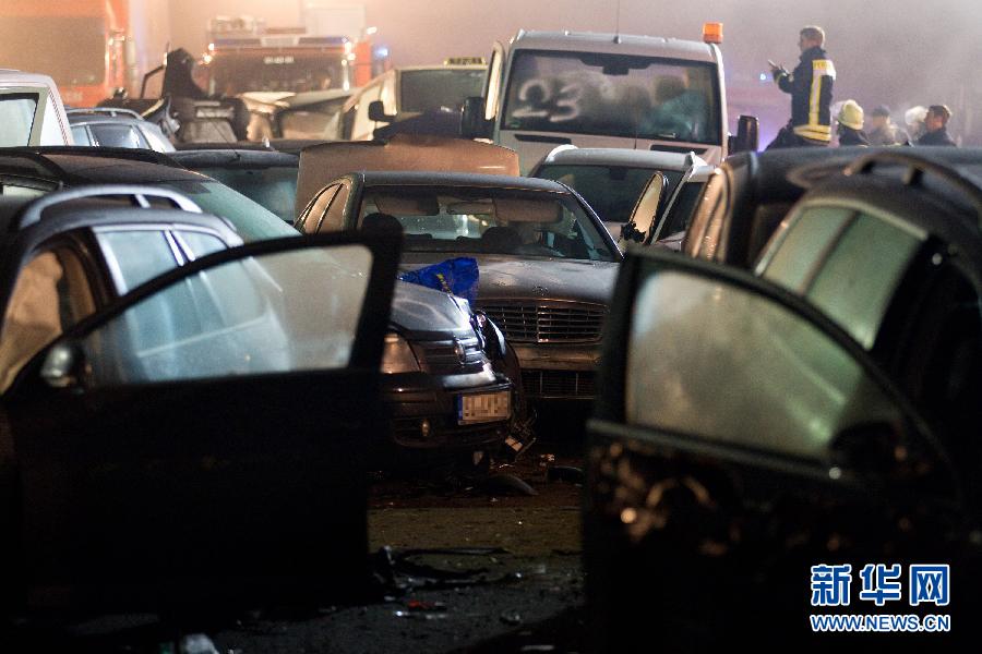 11月19日,在德國西北部的北威州A31高速公路上,救援人員在汽車連環(huán)相撞事故現(xiàn)場忙碌。 18日晚,這條高速公路發(fā)生追尾撞車事故,總計52輛車連環(huán)相撞,事故致死3人,致傷35人,其中14人傷勢嚴(yán)重。 新華社/法新