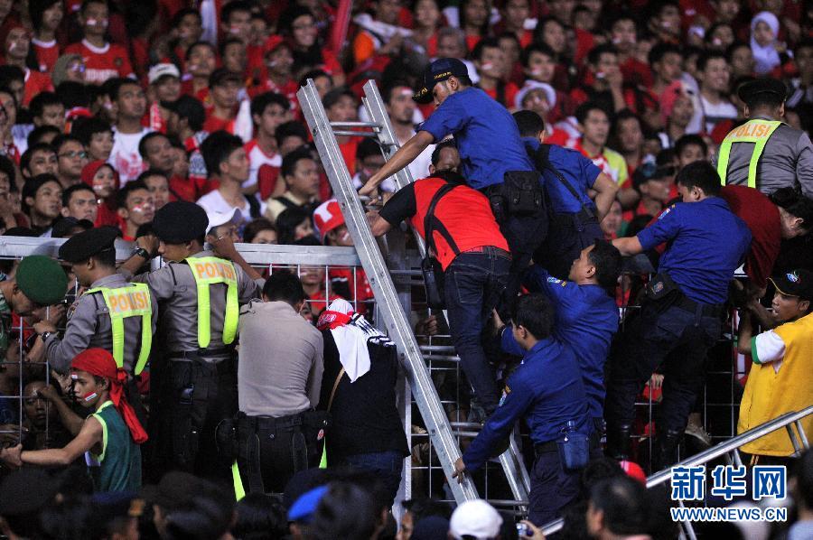 11月21日,當地安保人員疏散球迷。當日,在東南亞運動會男足決賽中,東道主印度尼西亞隊不敵馬來西亞隊。賽前,超過9萬名球迷像潮水般涌進球場,期間發生的踩踏事件造成兩名球迷死亡。新華社/法新