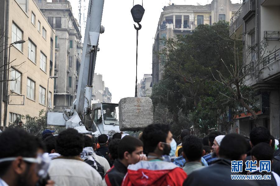 11月24日,在埃及開羅解放廣場附近的穆罕默德·馬哈茂德街,軍隊在設置路障。當日,解放廣場附近穆罕默德·馬哈茂德街道上示威者同軍警的沖突暫時停止,仍有部分人在解放廣場及周邊地區示威游行。埃及衛生部發言人希沙姆·希哈說,沖突已致死35人,其中31人在開羅,4人在其他城市。傷者增至3250人。新華社記者李木子攝
