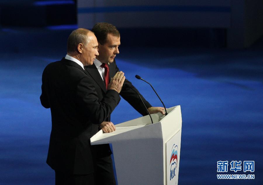 11月27日,在俄羅斯首都莫斯科,俄羅斯總統(tǒng)梅德韋杰夫(右)與總理普京在俄羅斯執(zhí)政黨統(tǒng)一俄羅斯黨的代表會(huì)議上共同在臺(tái)上發(fā)言。