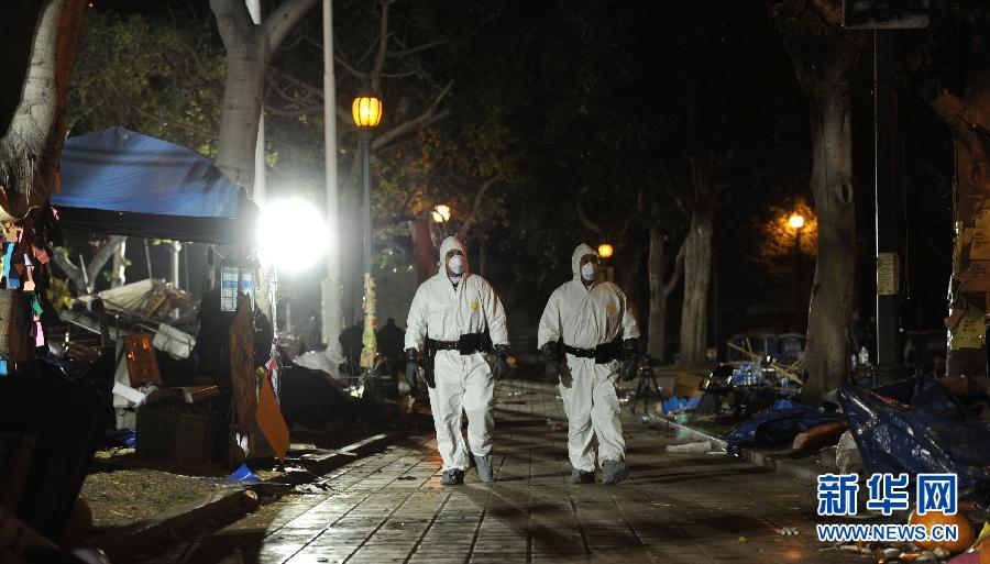 “占領洛杉磯”抗議示威者在美國洛杉磯市政廳前的營地30日凌晨被警方清除,有200多名示威者被逮捕。整個過程相對平靜,警方與示威者沒有發生沖突。愿意離開的示威者由警方護送離開,拒絕離開的示威者被警方逮捕。被逮捕者被送到附近的道奇體育館登記,而后將被帶往市拘留中心。新華社記者 楊磊 攝
