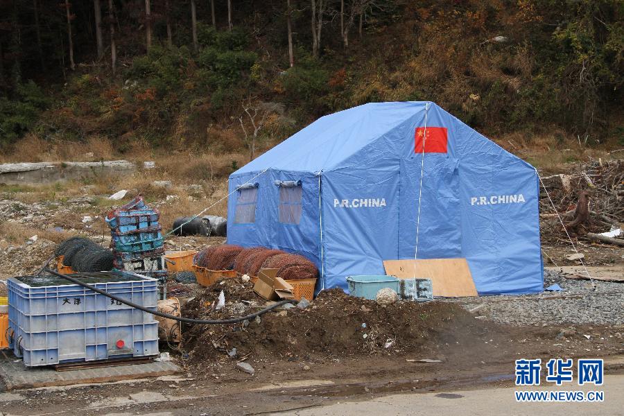 這是宮城縣石卷市雄勝町臨近海邊的一家漁業(yè)養(yǎng)殖公司仍在使用中國(guó)援助日本災(zāi)區(qū)的帳篷(2011年12月1日)。