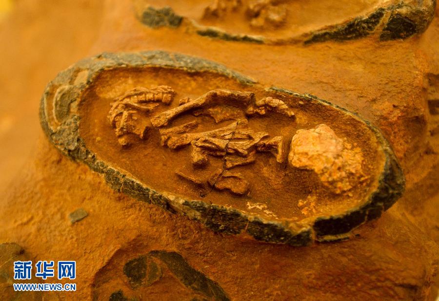 這是12月1日在中國駐美國洛杉磯總領館拍攝的一枚含有胚胎的恐龍蛋化石。美國海關官員1日將一批非法走私入境的恐龍蛋化石移交給中國,這是美方向中方移交的第三批古生物化石,也是中美兩國政府在打擊文物走私合作方面的最新成果。此次移交給中方的恐龍蛋化石共22枚,其中19枚含有小恐龍胚胎,恐龍蛋中蜷縮著的小恐龍骨骼清晰可見,屬稀有文物。這批化石是白堊紀時期竊蛋龍的蛋化石,出土于中國廣東南雄盆地,距今至少已有6500萬年歷史。新華社記者楊磊攝