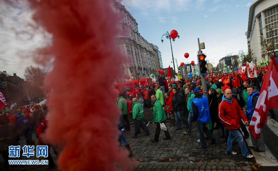 12月2日,在比利時首都布魯塞爾市中心,示威者走上街頭游行,抗議政府的經濟緊縮政策。