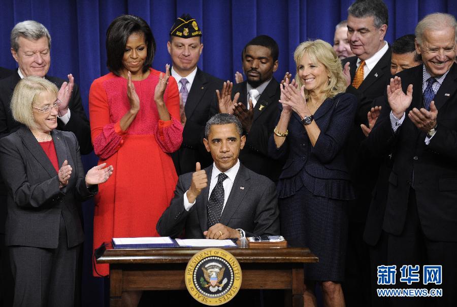 11月21日,在美國(guó)首都華盛頓白宮,美國(guó)總統(tǒng)奧巴馬(中)簽署一項(xiàng)幫助退伍軍人就業(yè)的稅收優(yōu)惠法案。這是近期奧巴馬政府推動(dòng)就業(yè)努力中首次獲得國(guó)會(huì)通過(guò)并簽署生效的一項(xiàng)舉措。新華社記者張軍攝