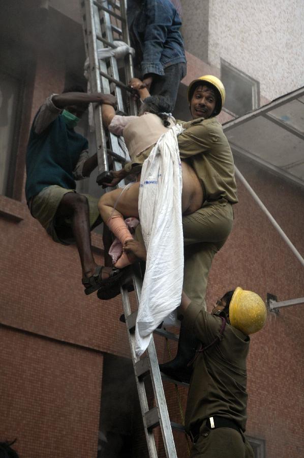 新華社照片,加爾各答,2011年12月9日 印度加爾各答大火致89人死亡 6名醫(yī)院高層被捕12月9日,在印度加爾各答,消防隊(duì)員將一名工作人員從失火醫(yī)院中救出。據(jù)印度加爾各答市警方消息,當(dāng)?shù)貢r(shí)間9日凌晨位于市區(qū)南部人口稠密地段的AMRI醫(yī)院大火目前已導(dǎo)致89人喪生,醫(yī)院6名董事會成員被捕。新華社發(fā)(蒙達(dá)爾攝)