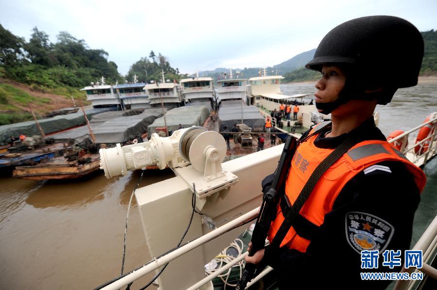 12月11日,中老緬泰四國聯合執法隊隊員在湄公河上巡邏警戒。 11日10時許,停靠在老撾班相果碼頭的5艘中老緬泰聯合巡邏執法船以及隨行的10艘商船繼續出發,通過孟巴里奧淺灘,駛入金三角區域。針對該地區嚴峻的毒品犯罪形勢,四國聯合巡邏執法將把打擊跨國毒品犯罪作為重要任務之一。新華社發(王小雪攝)
