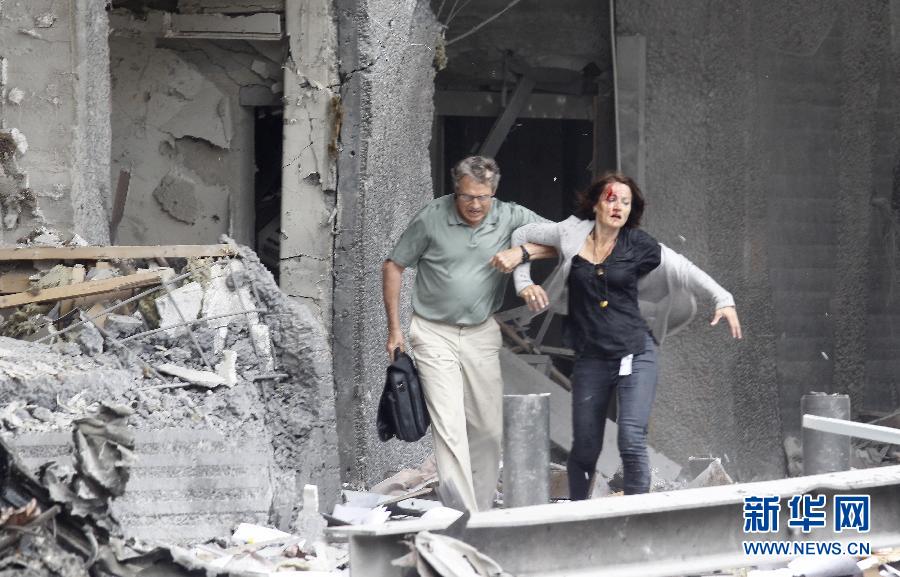 2011年7月22日,在挪威奧斯陸市爆炸現場,一名受傷婦女被攙扶出爆炸大樓。奧斯陸市中心及郊外約40公里處的于特島當天先后發生爆炸和槍擊事件,共造成92人死亡。新華社/美聯