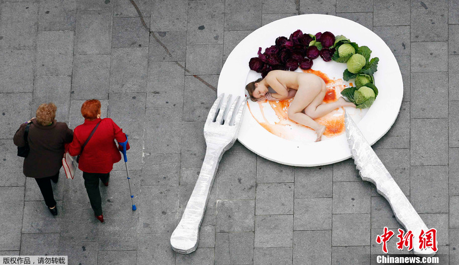 當地時間2011年12月15日,西班牙巴塞羅那,保護動物組織成員裸體躺在盤子中,抗議肉類消費。