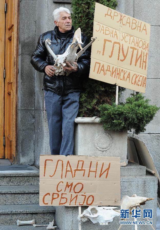 12月26日,一名塞爾維亞警察站在貝爾格萊德政府大樓前舉行罷工,其腳下的標語牌上寫著“塞爾維亞,我們在挨餓”。 新華社發