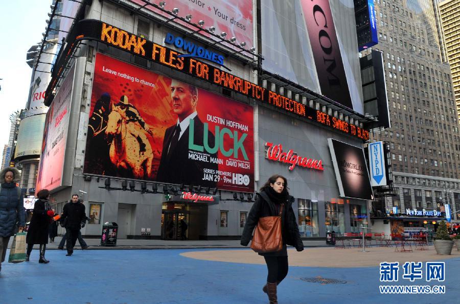 1月19日,行人在紐約時報廣場有關柯達最新消息的滾動新聞電子顯示屏下走過。影像產品巨頭美國伊士曼柯達公司19日宣布已在紐約州申請破產保護,以爭取渡過流動性危機,確保業務繼續運營?逻_膠卷曾是全球最成功的膠卷之一。1883年柯達公司的創始人伊士曼發明膠卷,1888年第一部柯達照相機上市,開啟大眾攝影新時代,其成功神話延續百余年。到1981年,柯達公司的銷售額沖破100億美元。近年來,柯達公司在向數碼設備轉型階段喪失了許多傳統的膠片業務,競爭力不斷下降,導致這家擁有100多年歷史的公司不得不決定出售旗下眾多專利以維持現金流。新華社記者王雷攝