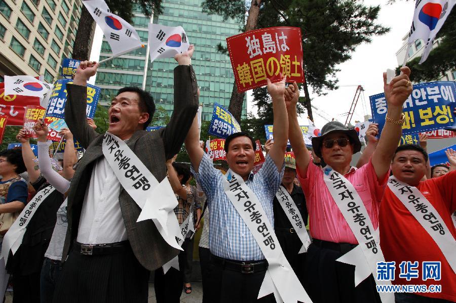 8月17日,韓國(guó)保守團(tuán)體會(huì)員在首爾日本駐韓使館前舉行示威,譴責(zé)日本爭(zhēng)奪獨(dú)島(日本稱竹島)主權(quán)。 新華社發(fā)(樸真熙攝)