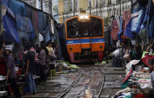 據英國《每日郵報》8月16日報道,位于泰國沙沒頌堪市(Samut Songkhram)的美功鐵道市場堪稱是世界上最危險的集市,它就位于鐵軌兩側,火車每天要從這里穿過8次。水果蔬菜攤販以及購物者要時刻保持警惕,注意躲閃火車。