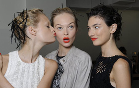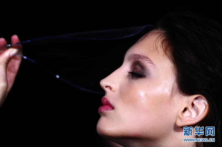9月18日,在西班牙馬德里時裝周上,造型師為一名模特補妝。 2012馬德里春夏時裝周于9月16日至20日舉行。 新華社記者陳海通攝