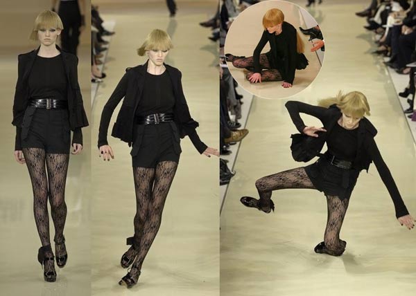 歷年T臺(tái)上摔跤事故頻頻,讓不少大牌模特吃盡苦頭出盡洋相。駕馭著10厘米以上的高跟鞋,模特在聚光燈下和無(wú)數(shù)攝影機(jī)前,以及萬(wàn)眾目光下,轟鳴背景音樂(lè)中,邁著“搖晃”的貓步,要有多大勇氣才能讓自己顯得信心十足?讓我們來(lái)看看那些每一步都如履薄冰卻依舊運(yùn)氣欠佳的模特們。