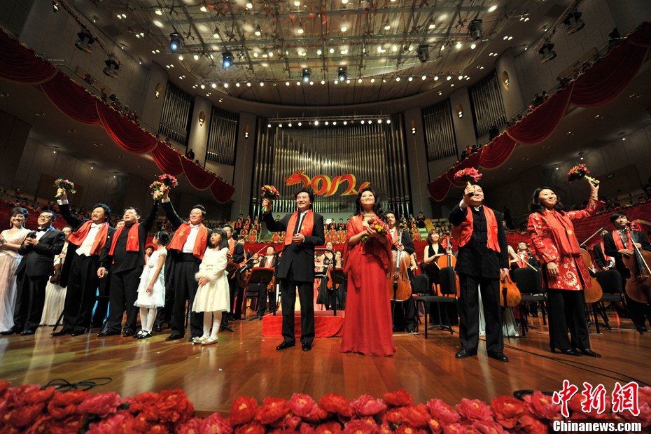“龍鳳呈祥——全球華人新春音樂盛典2012”由著名指揮家陳佐湟、呂嘉執棒國家大劇院管弦樂團演奏。管風琴家沈凡秀、笛子演奏家戴亞、鋼琴演奏家居覲、小提琴演奏家呂思清、男中音歌唱家袁晨野等海內外知名的華人藝術家獻上了精彩演出。許戈輝、竇文濤、沈星和尉遲琳嘉擔任音樂盛典司儀。圖為謝幕后藝術家向觀眾致意。中新網記者 金碩 攝