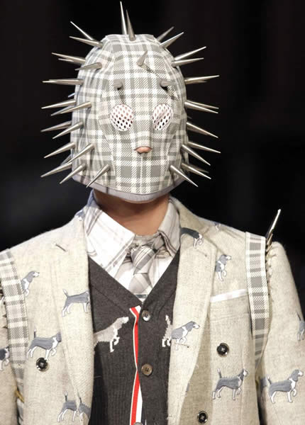 記者朱盈庫報(bào)道,在日前進(jìn)行的巴黎時(shí)尚周的一次時(shí)裝展覽上,美國設(shè)計(jì)師桑姆·布郎尼 (Thom Browne)和比利時(shí)設(shè)計(jì)師Walter Van Beirendonck展出了他們創(chuàng)作的怪異服裝。兩位設(shè)計(jì)師給作品加入了離奇怪異的元素,他們用帽子和面具掩蓋住一些模特的面部,增添了搞怪效果。
