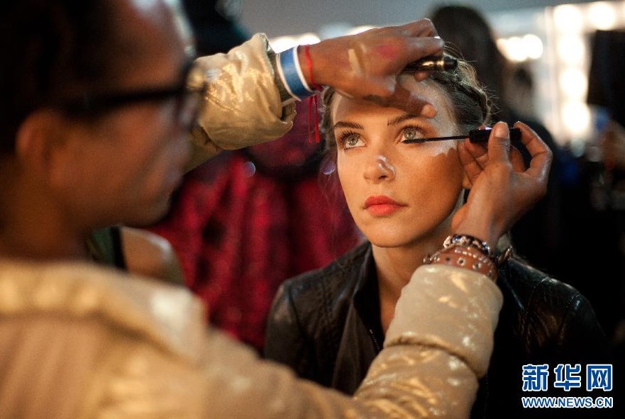 間,化妝師為模特化妝。 新華社/美聯(lián)