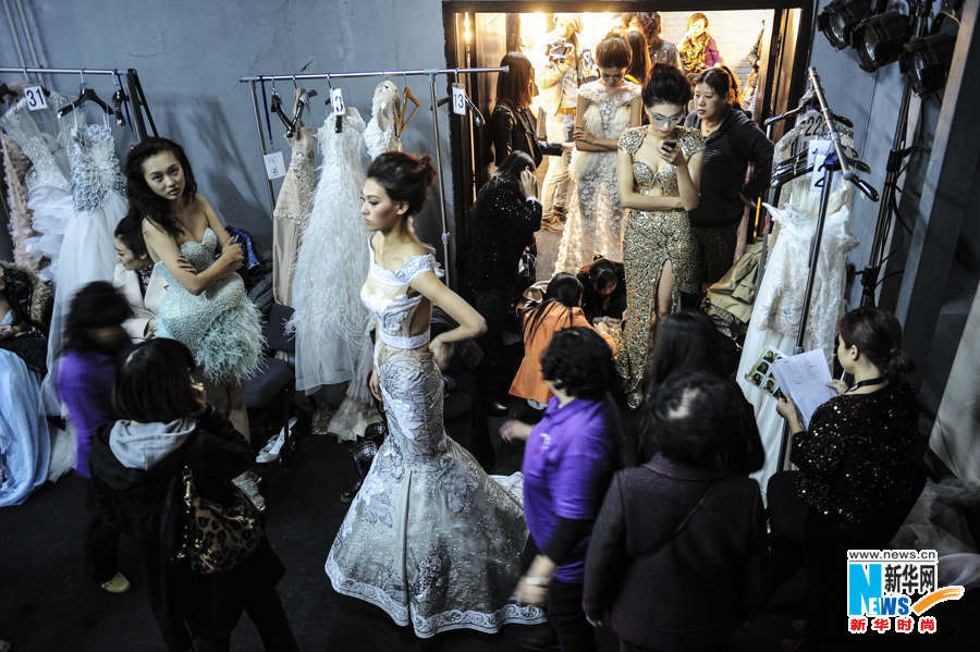 2012年10月30日,即將登場的各位模特在后場準備。新華網 李欣 攝