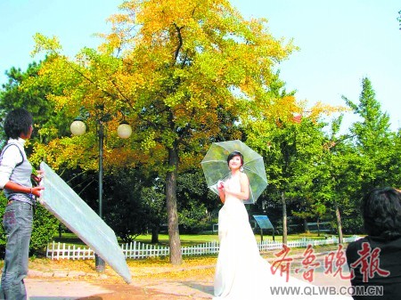 ▲19日,在青島八大關(guān),新人們?cè)谝豢靡呀?jīng)披上"黃金甲"的銀杏樹下拍照留念。專家預(yù)計(jì),10月底到11月初將是島城今年銀杏樹的最佳觀賞期。 記者 胡希平 攝