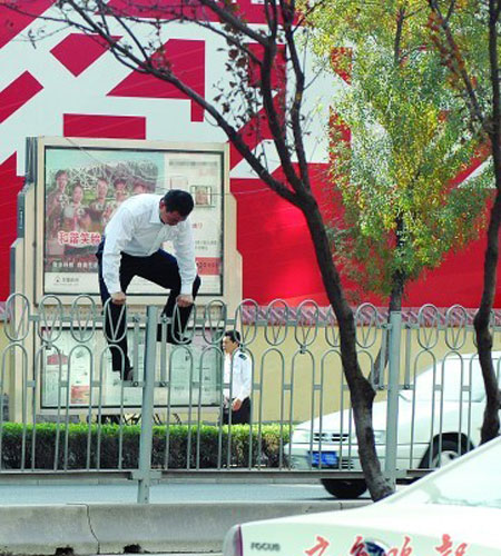 17日,一名男子在濼源大街艱難地翻越已經(jīng)加高的護(hù)欄。為了杜絕行人翻越護(hù)欄,交警部門(mén)加高了濼源大街部分路段護(hù)欄,但仍有個(gè)別人舊習(xí)難改。翻越者跨過(guò)了護(hù)欄,卻丟掉了安全意識(shí)和社會(huì)責(zé)任。