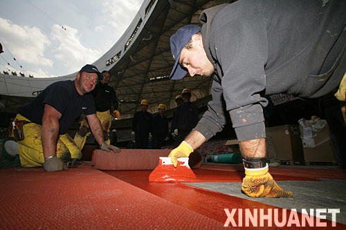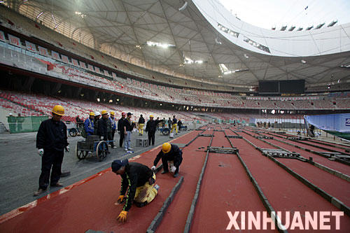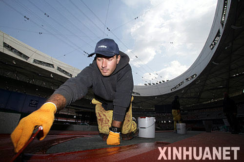 3月30日,北京奧運會主體育場――國家體育場“鳥巢”開始鋪設塑膠跑道。 新華社發(黎方益 攝)