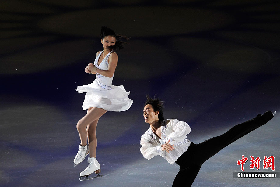 11月7日,2010年中國杯世界花樣滑冰大獎(jiǎng)賽答謝表演在北京首都體育館進(jìn)行,所有參賽運(yùn)動(dòng)員為觀眾奉獻(xiàn)上了一場美輪美奐的冰上舞蹈盛宴。中新社記者 富田 攝