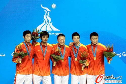 11月16日,中國選手王皓在比賽中回球。當日,在廣州舉行的第16屆亞運會乒乓球男團決賽中,中國隊以3比0戰勝韓國隊,奪得冠軍。